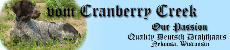 Welcome to vom Cranberry Creek Deutsch Drahthaar.  We are a registered VDD/GNA (Verein Deutsch Drahthaar e. V. Group North America) breeder dedicated to the improvement of the Deutsch Drahthaar (DD), the world's most versatile hunting dog. A VDD/GNA member since 2000, we established our kennel in 2003. Our dogs are surrounded by acres of fields and forest which provide ample opportunities to develop their inherited natural abilities.